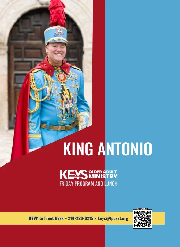 Fridays | 11:00 AM | Westminster Hall The main program on Fridays (September - May) begins at 11:00 AM with lunch ($15) starting at noon. We need to know the number of people who will join us each week to make sure we have enough meals for everyone. Please RSVP by contacting the church front desk at (210) 226-0215 submit below. One Friday each Month | 11:30 AM | Local Restaurant Join us for our monthly birthday celebrations at a local restaurant, typically on the third Friday of each month. You can meet us there at 11:30 AM or hop on the shuttle departing from FPC at 10:30 AM. The cost for off-site birthday lunches is $15. Reserve your spot by signing up at the front desk, calling 210-226-0215 or emailing KEYS. Don't miss out on the fun! Fridays | 9:30 AM | Zoom & Live Streamed in Room 224 We were fortunate to find Jacqueline Crow to conduct an online fitness program for us via Zoom. Jacqi has been a champion for us and everyone loves the time with her. If you want to be included on the email notifications, send an email to KEYS. You will be sent a link to join the Zoom Meeting. There will be a TV in Room 224 at 9:30 AM so that you can participate in the fitness group and also make it to KEYS at 11:00 AM. 2nd & 4th Fridays | 1:00 PM | Geneva Room Join in on the fun game of Mahjong at FPC! Beginners are always welcome and gentle, kind instruction is offered as we have fun together. Contact Nancy Black for more information! If your AARP Safe Driving Class insurance discount is expiring, you can take the class online at https://www.aarpdriversafety.org/.